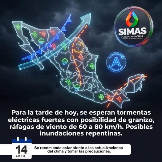Este 14 de abril, se pronostican tormentas eléctricas intensas para la tarde en Acuña, acompañadas de posible caída de granizo y ráfagas de viento de entre 60 y 80 km/h.