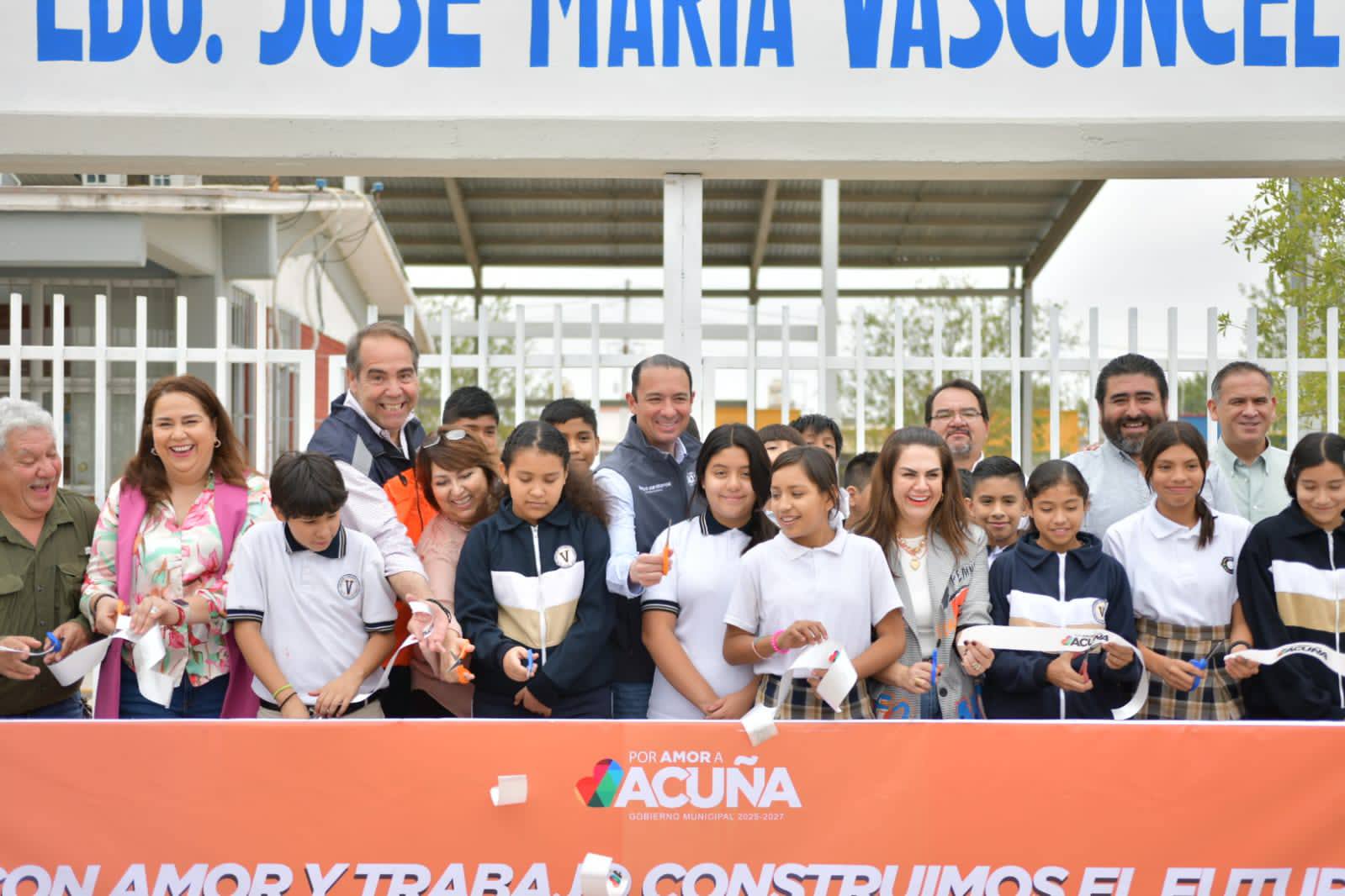 Acuña, Coahuila; 18 de noviembre de 2025.- El alcalde Emilio De Hoyos Montemayor entregó la nueva barda perimetral de la Escuela Secundaria José María Vasconcelos, ubicada en el fraccionamiento La Misión, como parte del programa Por Amor a Mi Escuela.